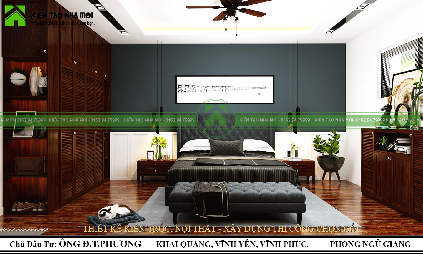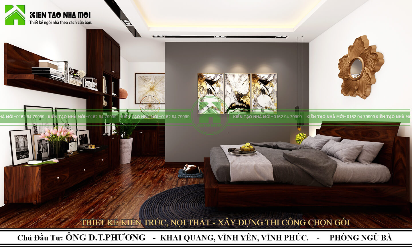 Ngay khi bước vào Phòng ngủ Chính, mảng tường sơn màu ghi nổi bật với 3 bức tranh trang trí. Căn phòng đầy đủ chức năng dành cho nơi nghỉ ngơi – thư giãn sau mỗi ngày dài làm việc. Các chậu cây xanh điểm xuyết là làn gió tươi mới đầy hứng khởi không bao giờ thiếu trong mỗi thiết kế của chúng tôi.